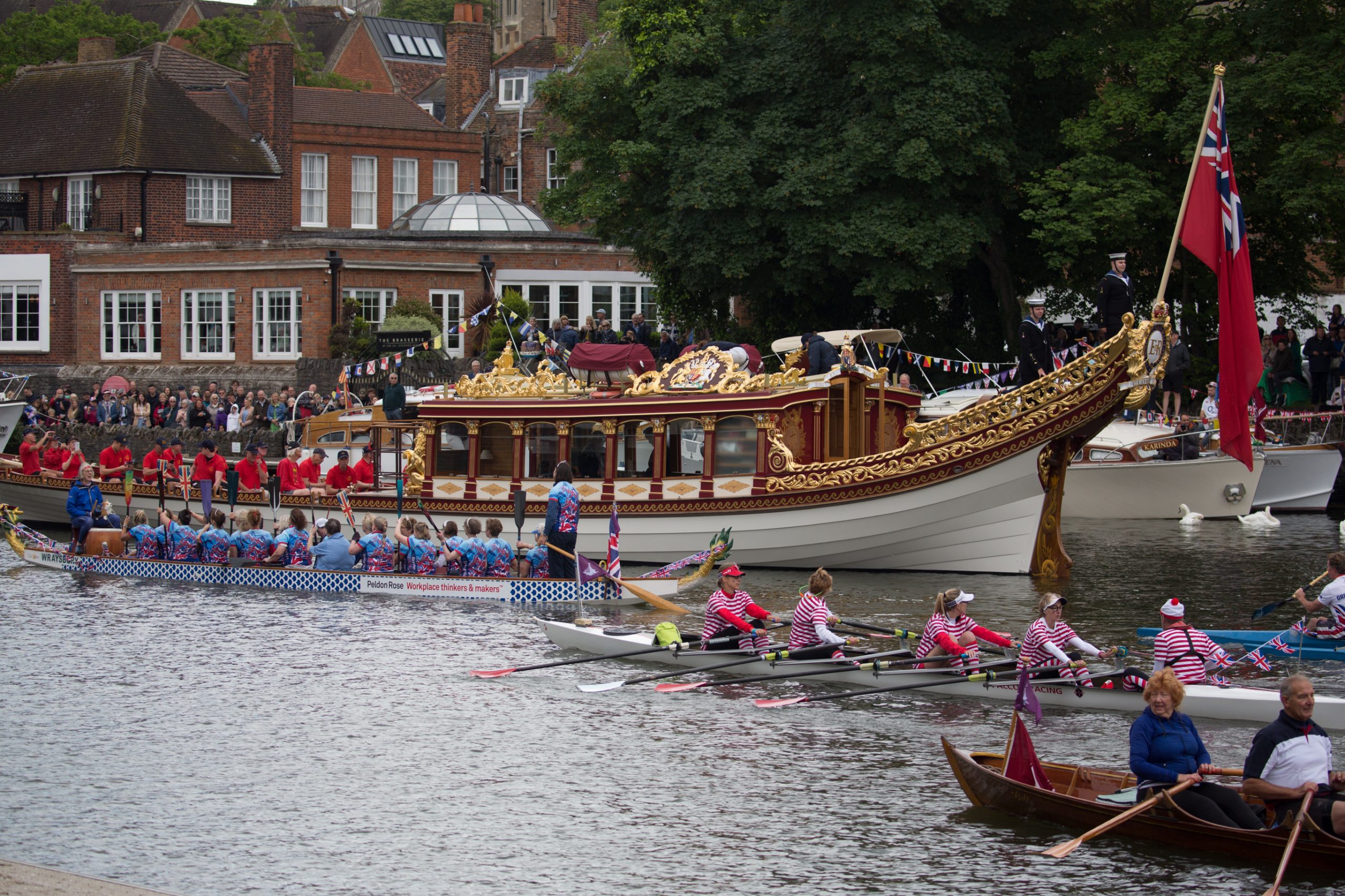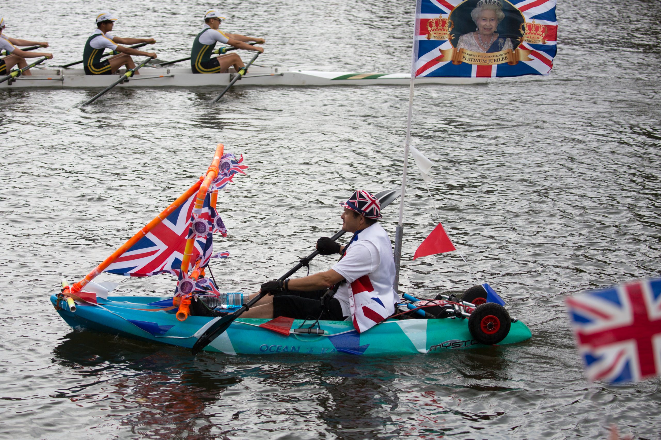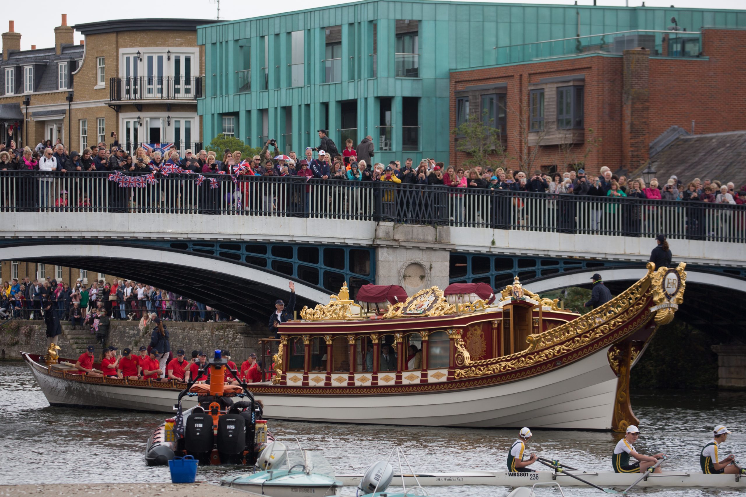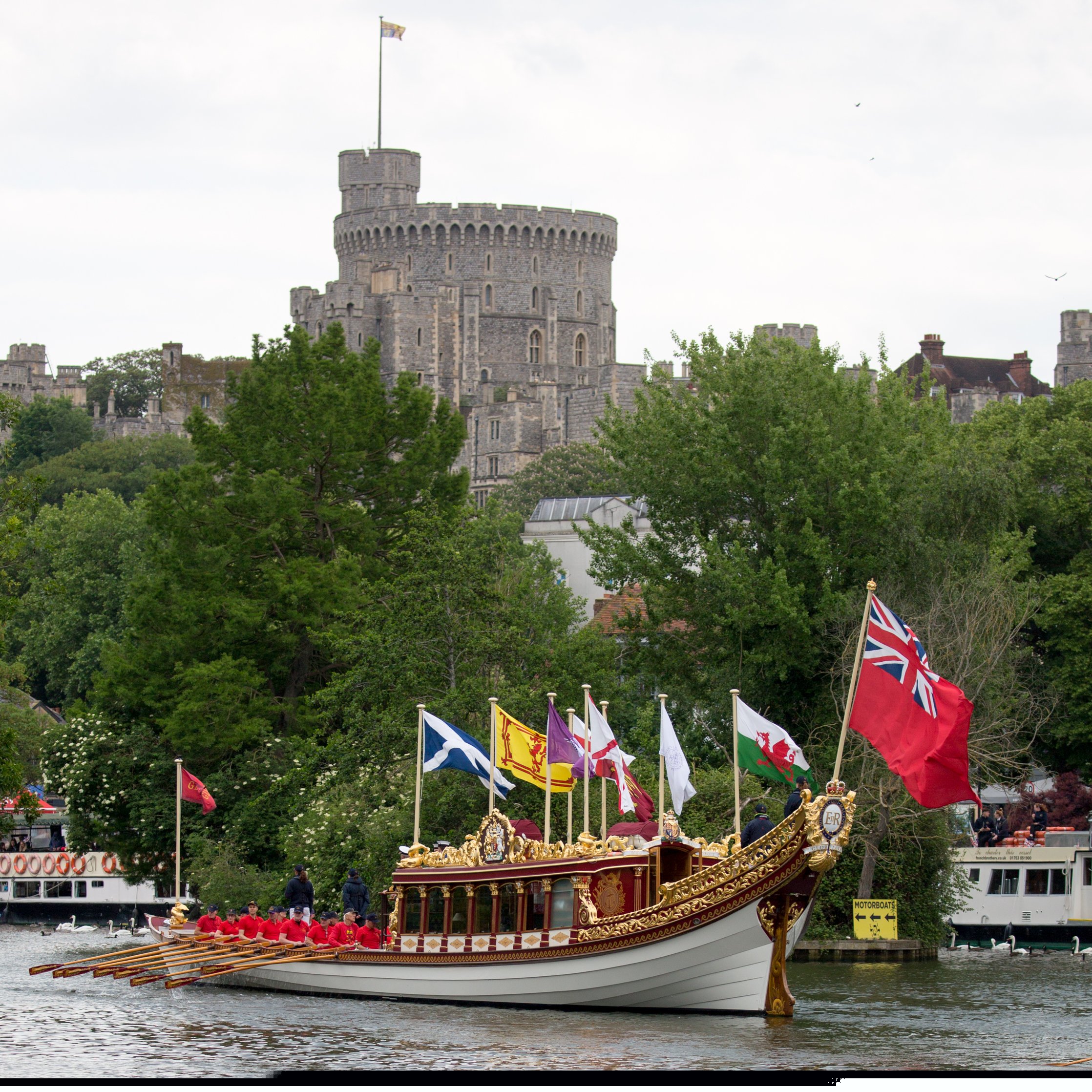 On the morning of Saturday 4th June the Platinum Jubilee Flotilla – a Rowing Procession on the Thames – journeyed through Windsor. The flotilla which was led by the Queen’s Row Barge, Gloriana - by kind permission of Her Majesty The Queen and Lord Sterling - consisted of up to 30 different types of rowing craft including some racing boats, touring quads, some beautiful wooden skiffs, a Bedford Whaler, an outrigger kayak and a dragon boat. The procession rowed down the Thames from Boveney Lock, travelling downstream through Windsor on their journey to Staines, with representatives from rowing clubs in the local area taking part, along with rowers from the Windsor Boys School.