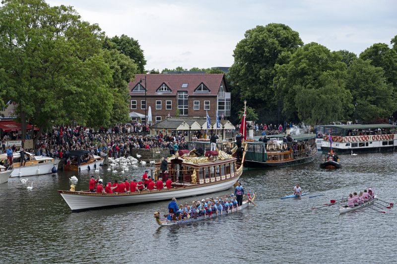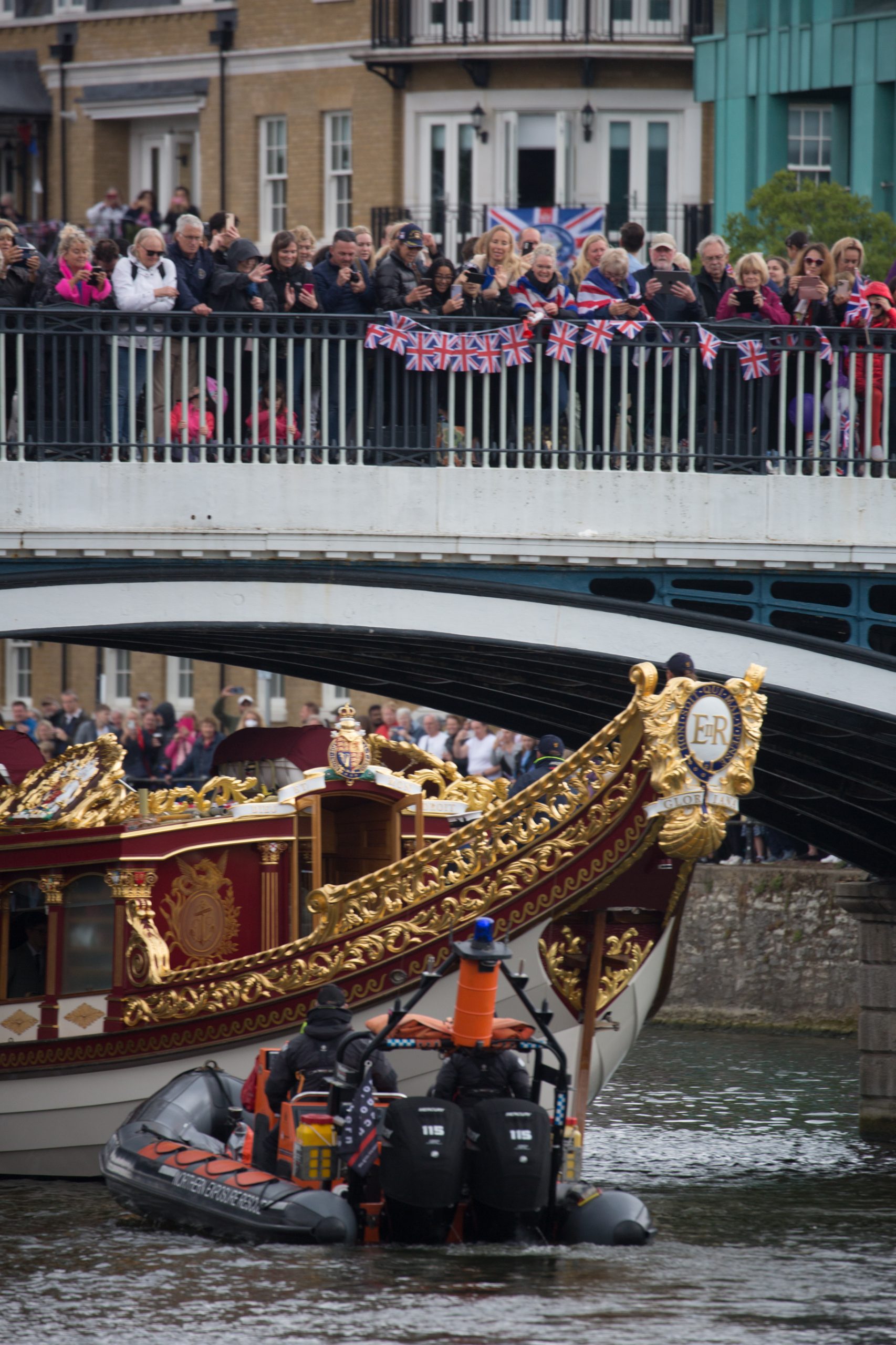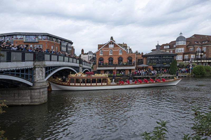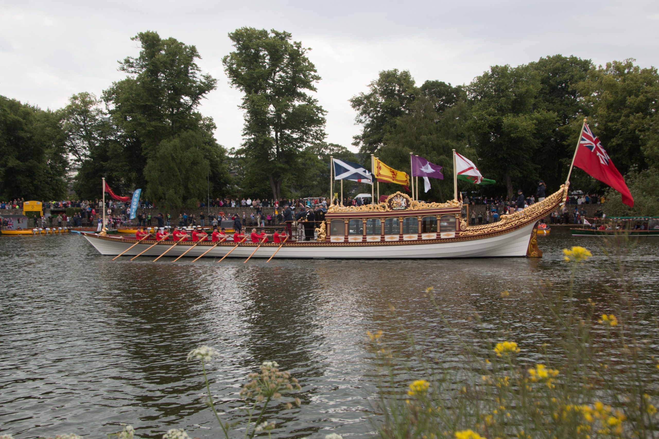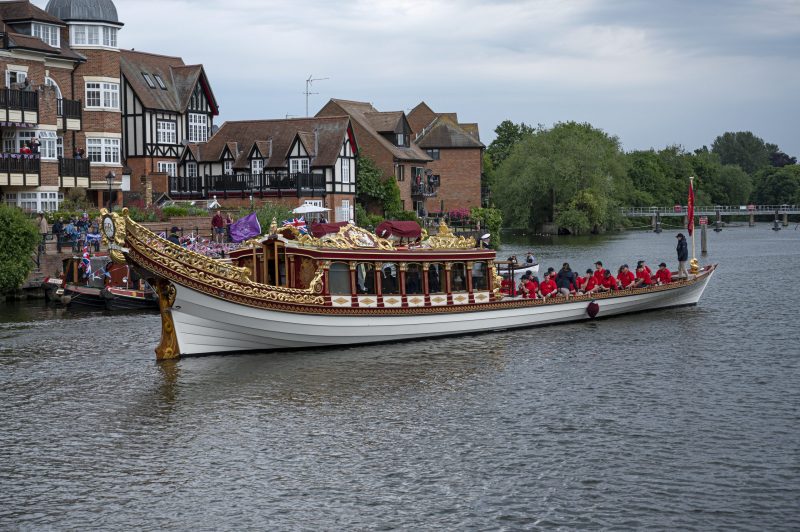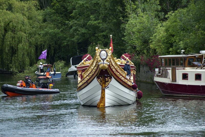 Windsor was privileged to be able to welcome the wonderful Gloriana which had on board Lord Sterling, the Lord Lieutenant of Berkshire James Puxley, the new Mayor of our Royal Borough Cllr Christine Bateson, the Chairman of British Rowing Mark Davies, along with other invited guests. The rowing procession saluted by raising their oars, before Gloriana carefully proceeded under the bridge and on towards Romney Lock. The procession was watched and cheered on by the hundreds of people who gathered at the Brocas, Eton bridge and along the riverbanks to enjoy the exciting spectacle.