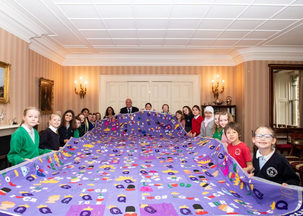 The morning of Tuesday 10th May was very special for 19 schoolchildren from our local area. Having worked incredibly hard at the Dhaaga Sewing Club to create a tapestry for Her Majesty for the Platinum Jubilee, they came with their inspirational leader, Anita Kulkani, to present it to Admiral Sir James Perowne, Governor of Windsor Castle, who accepted it on behalf of Her Majesty.