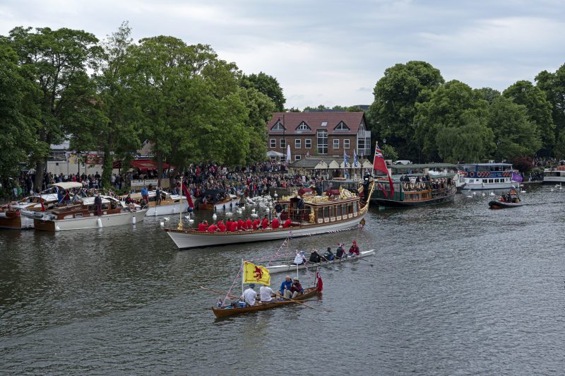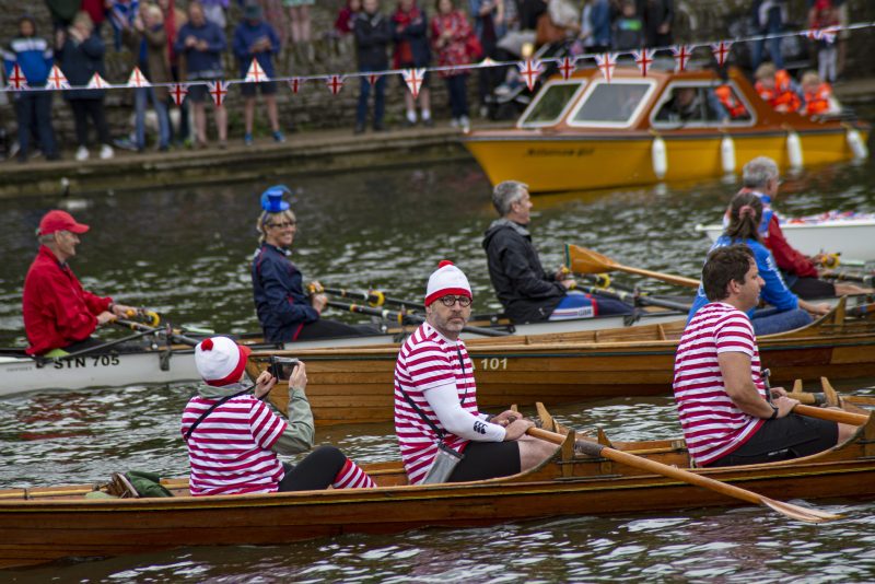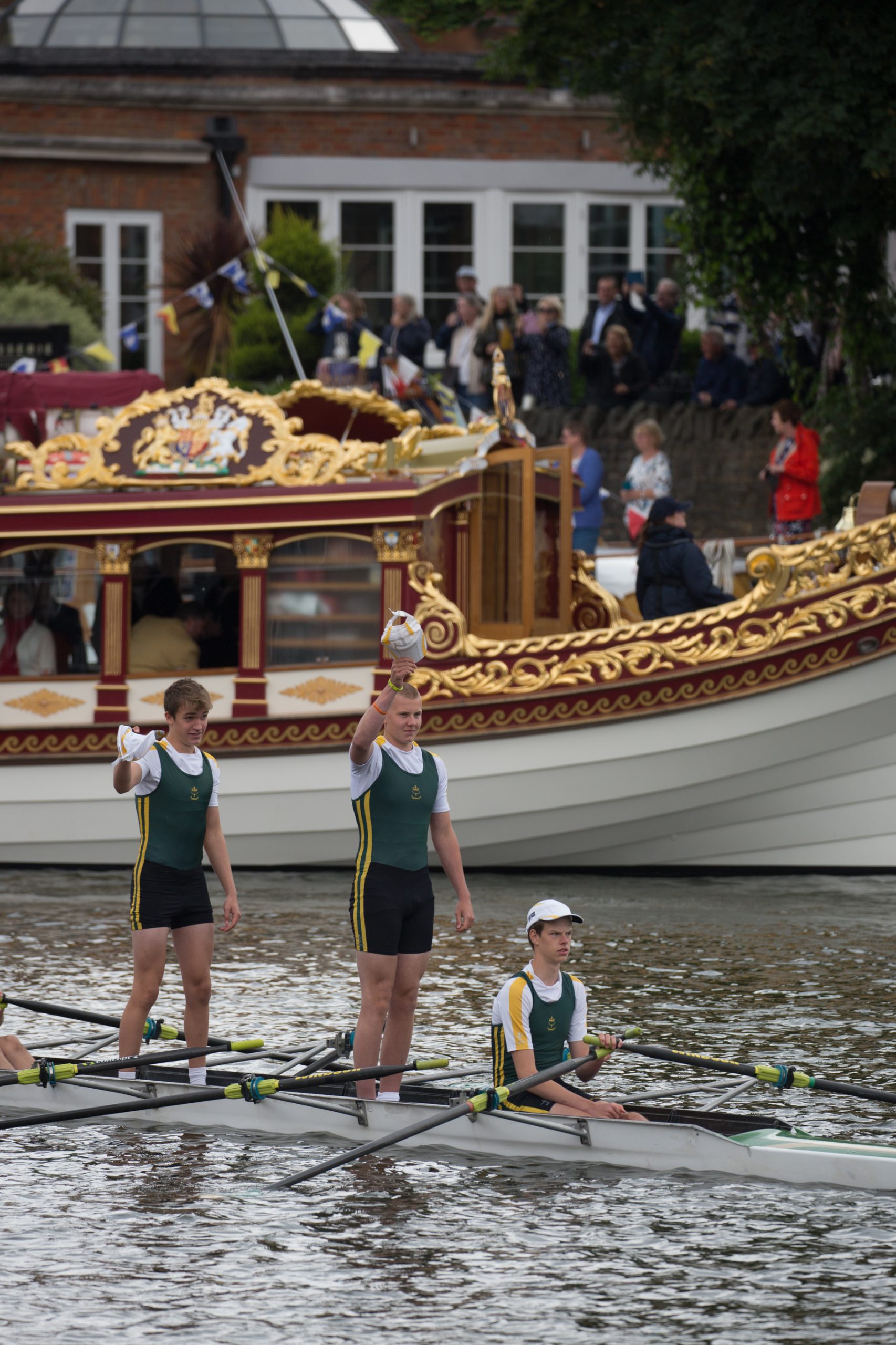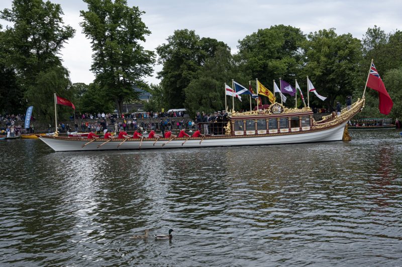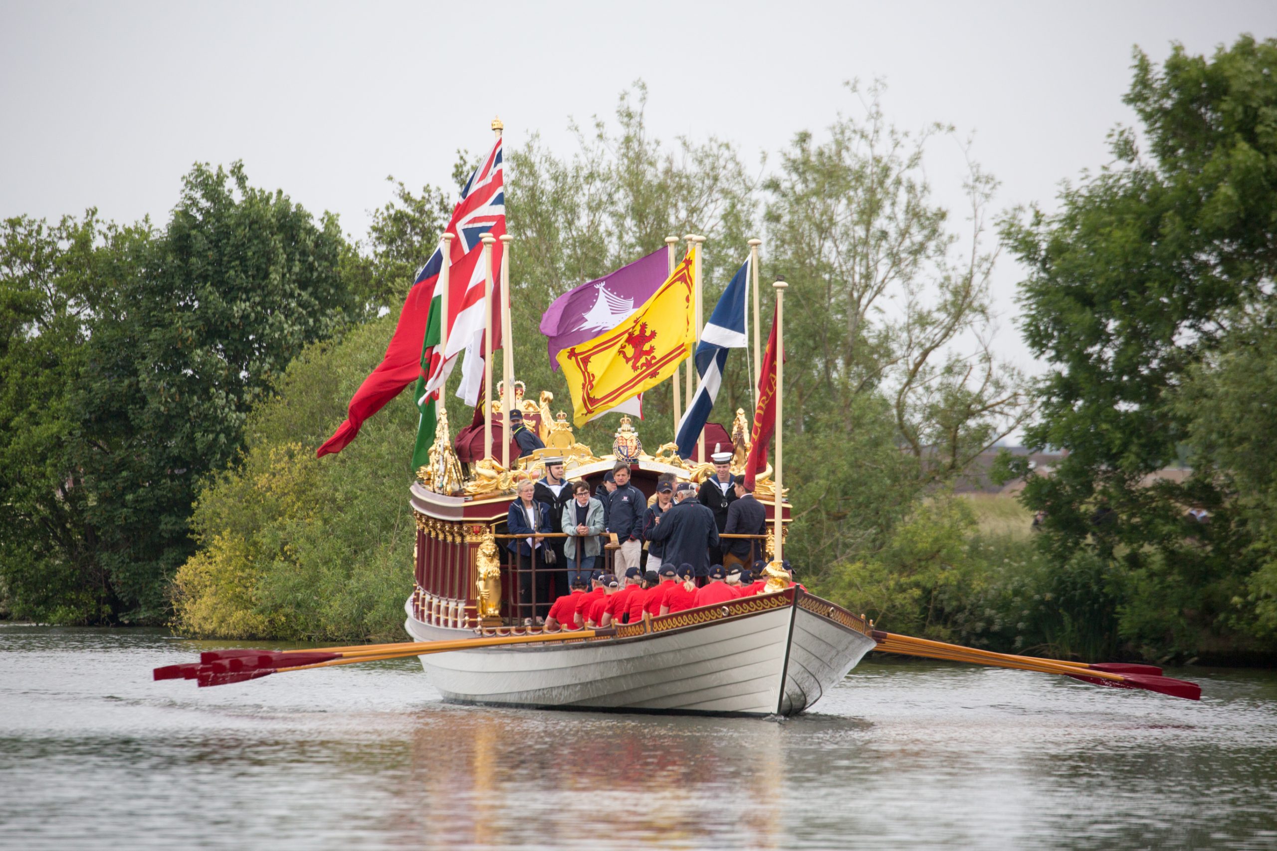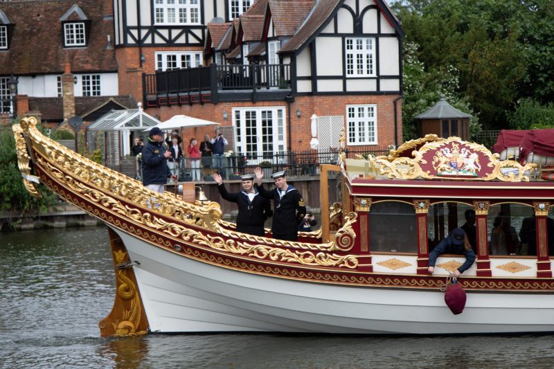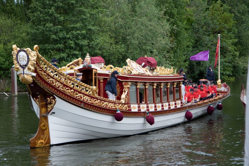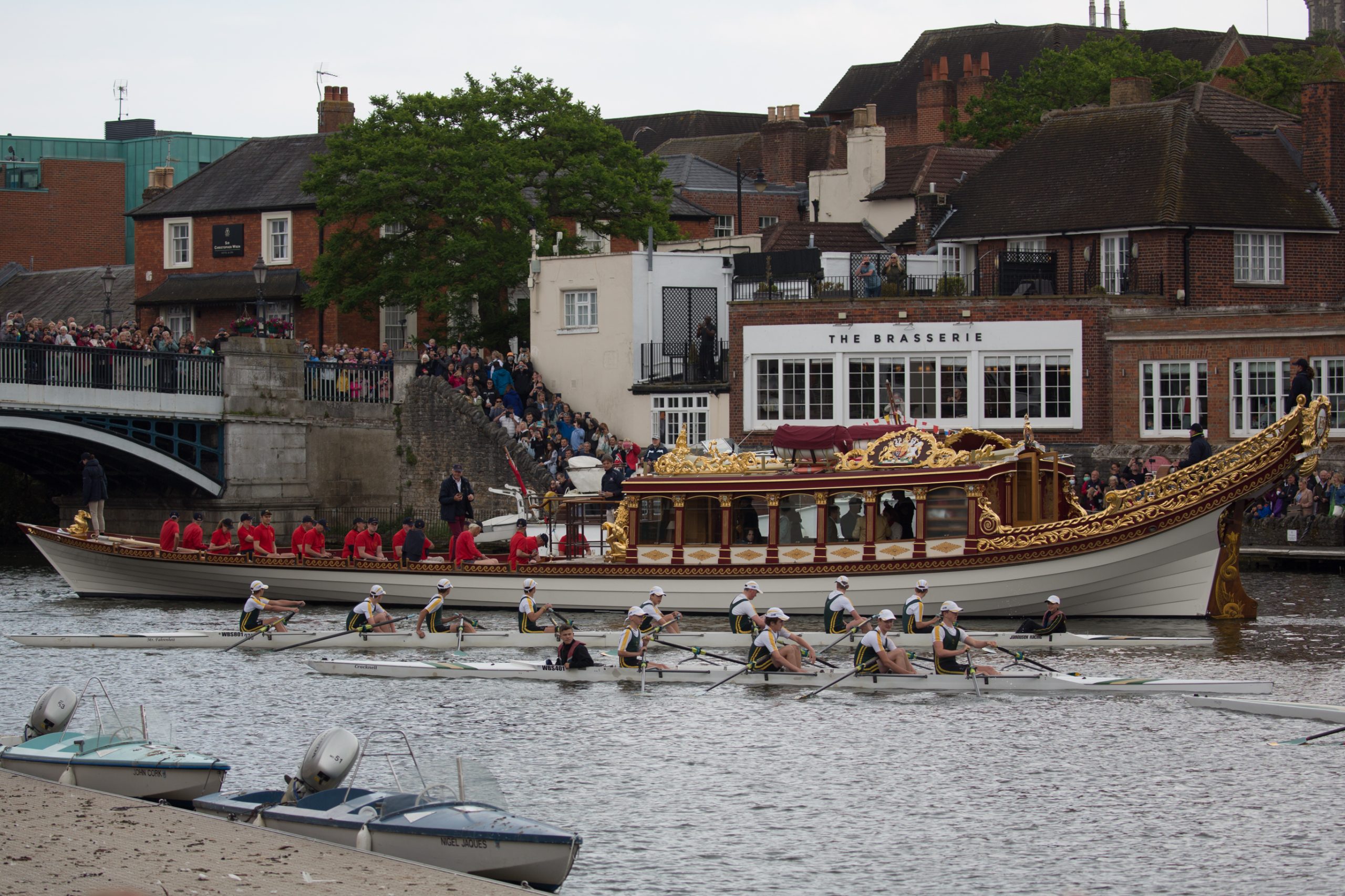 Windsor was privileged to be able to welcome the wonderful Gloriana which had on board Lord Sterling, the Lord Lieutenant of Berkshire James Puxley, the new Mayor of our Royal Borough Cllr Christine Bateson, the Chairman of British Rowing Mark Davies, along with other invited guests. The rowing procession saluted by raising their oars, before Gloriana carefully proceeded under the bridge and on towards Romney Lock. The procession was watched and cheered on by the hundreds of people who gathered at the Brocas, Eton bridge and along the riverbanks to enjoy the exciting spectacle.